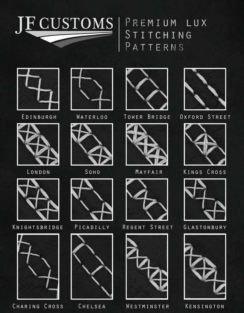 For more leather, stitching colour, and pattern options: please refer to the attached charts in the photos. After your purchase is complete, please send us message with the sample number & stitching pattern you would like, and we can get that custom produced for you at no extra cost, with fast dispatch!