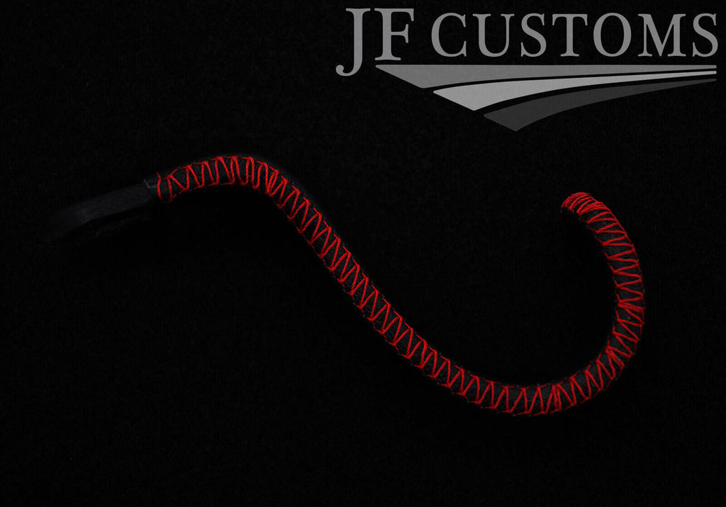 Black leather with an embossed British flag and stitching colour as per title.