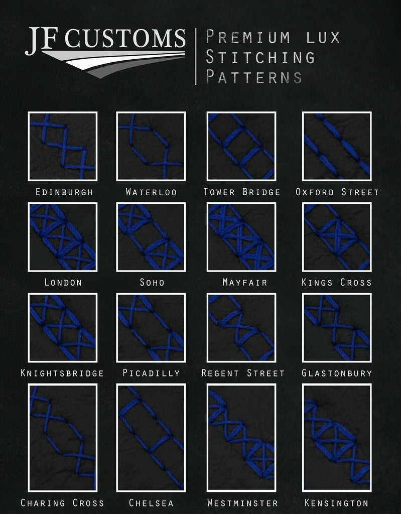 For more leather, stitching colour, and stitching pattern options: Please refer to the attached charts in the photos. After your purchase is complete, please send us a message with the sample number & stitching patterns you would like, and we can get that custom produced for you at no extra cost, with fast dispatch!