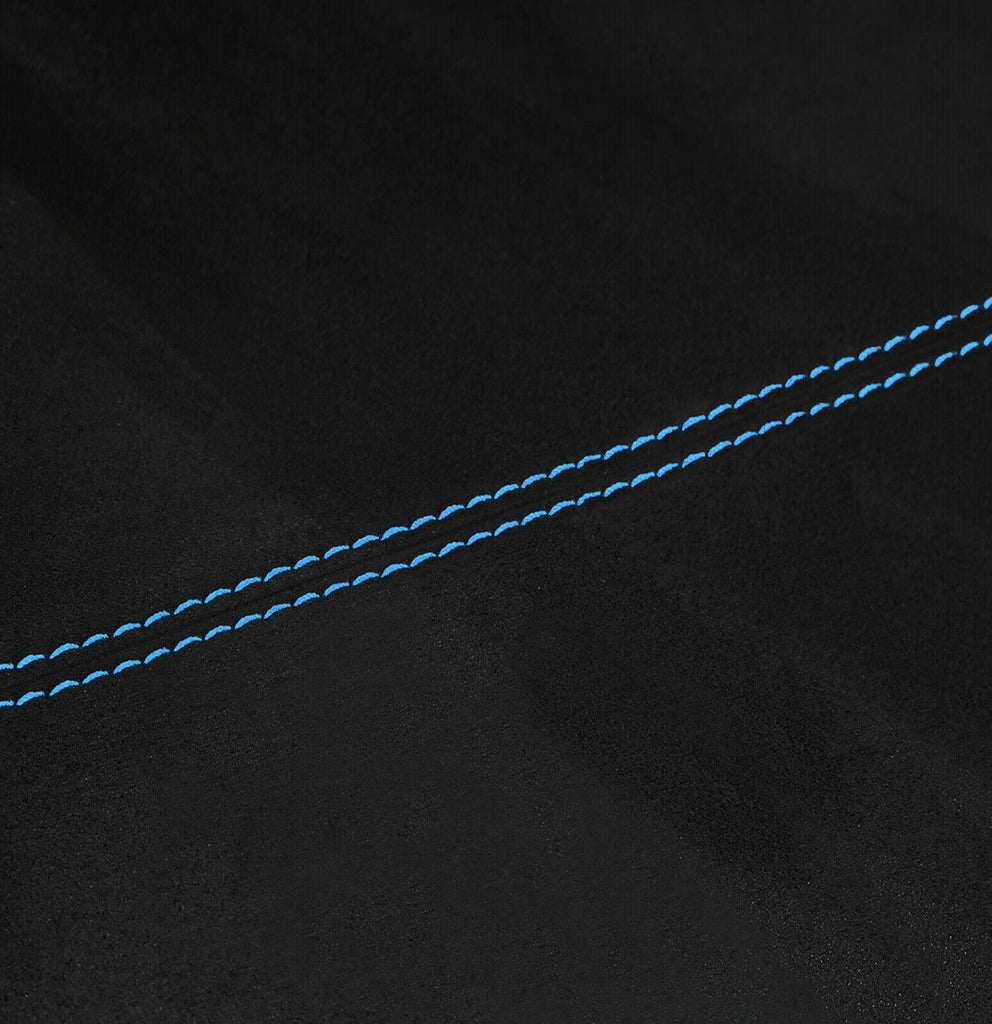 Black luxe suede with stitching colour same as on the title