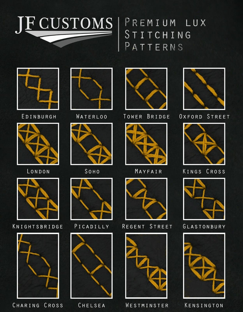For more leather, stitching colour, and pattern options: please refer to the attached charts in the photos. After your purchase is complete, please send us message with the sample number & stitching pattern you would like, and we can get that custom produced for you at no extra cost, with fast dispatch!